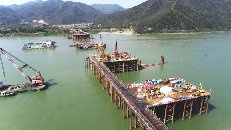 在全體建設者的日夜奮戰下,楊梅西江特大橋建設快速推進,南北岸引橋樁基已完成90%,6~9#墩剩余樁基正加快施工,10#墩鋼管樁圍堰已完成施工。